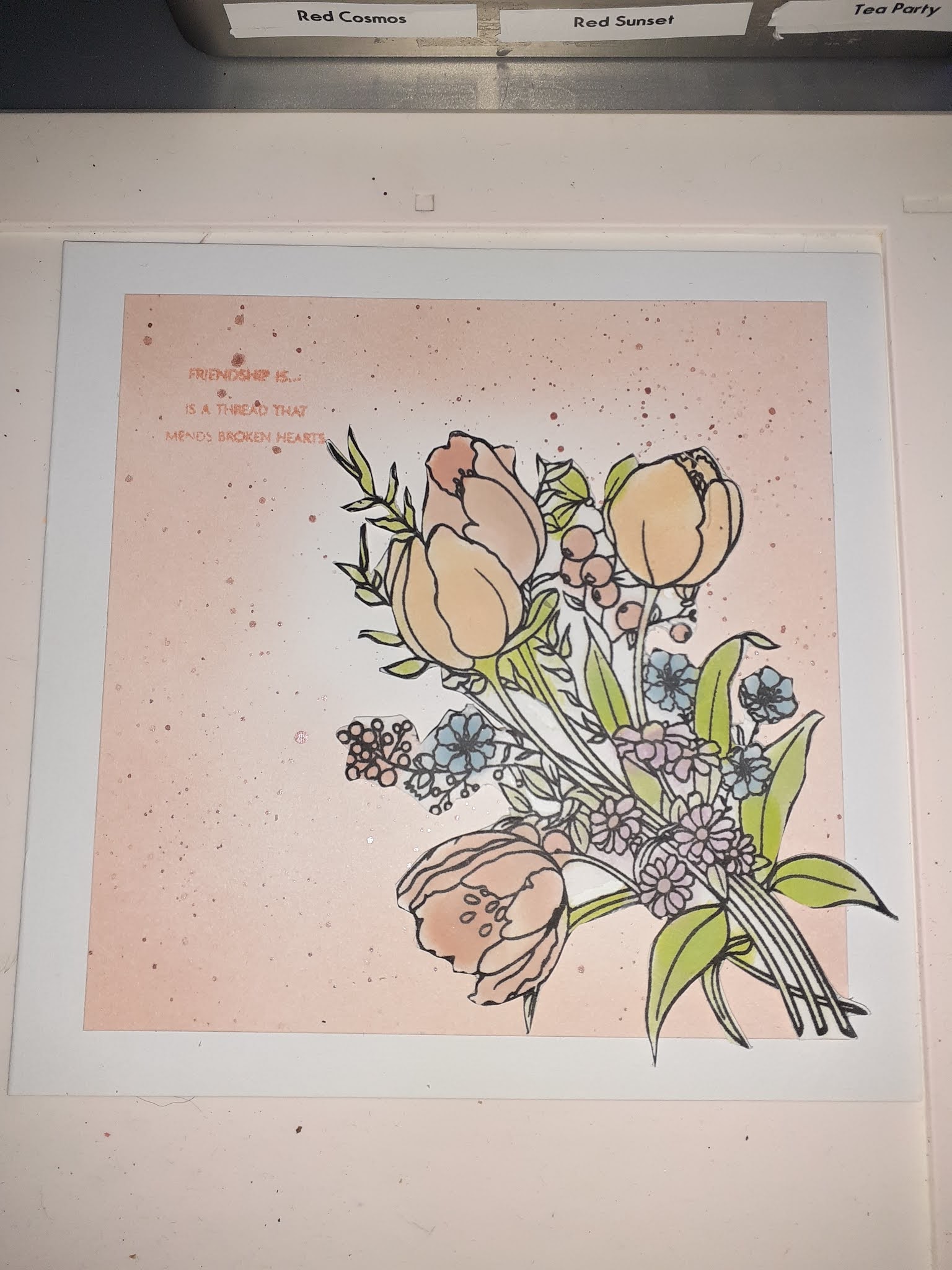 Go back to your back ground and stamp sentiment in Rouge ink.