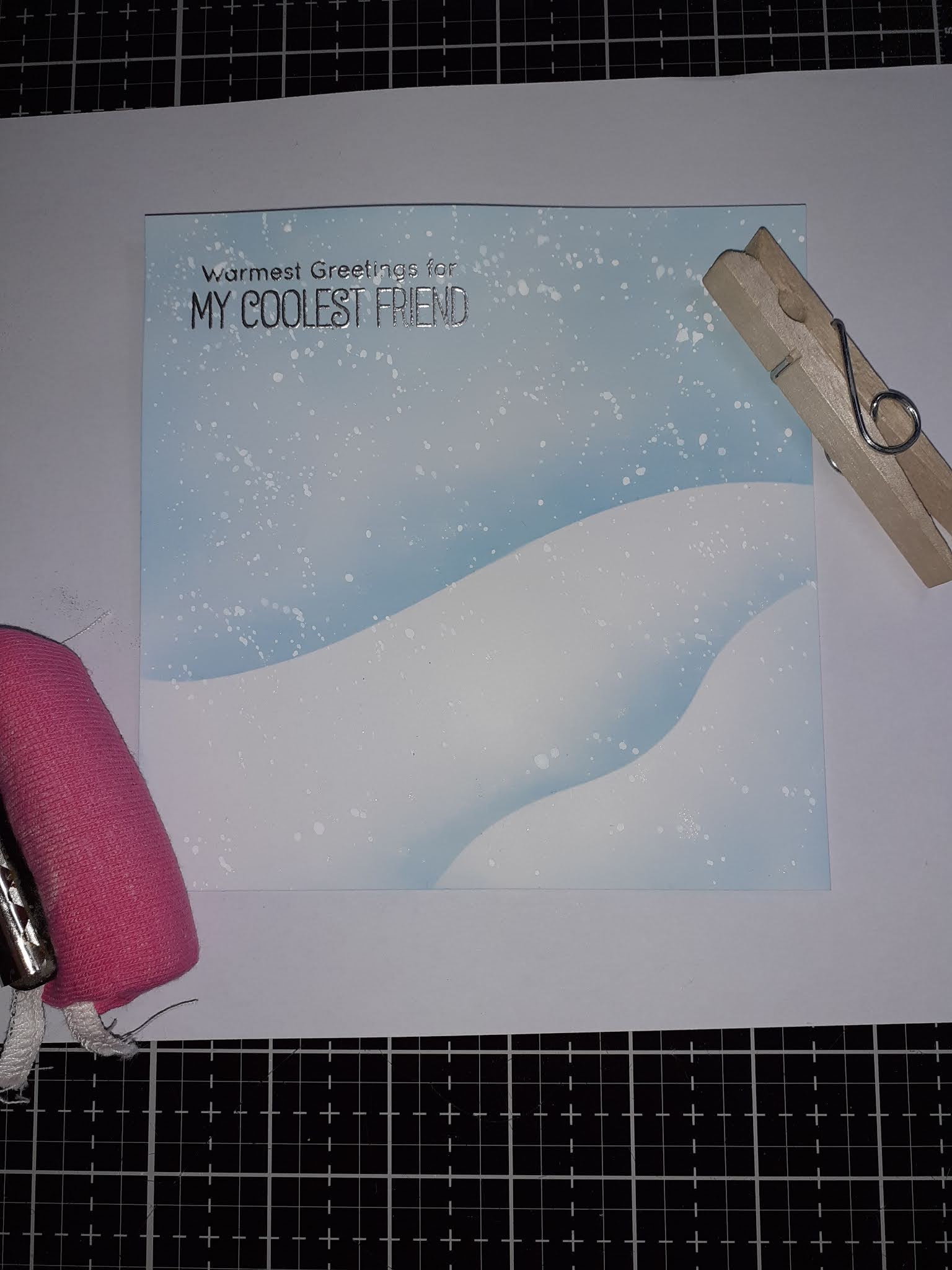 Next I heat embossed the sentiment and splatted on the gouche paint to look like snow.