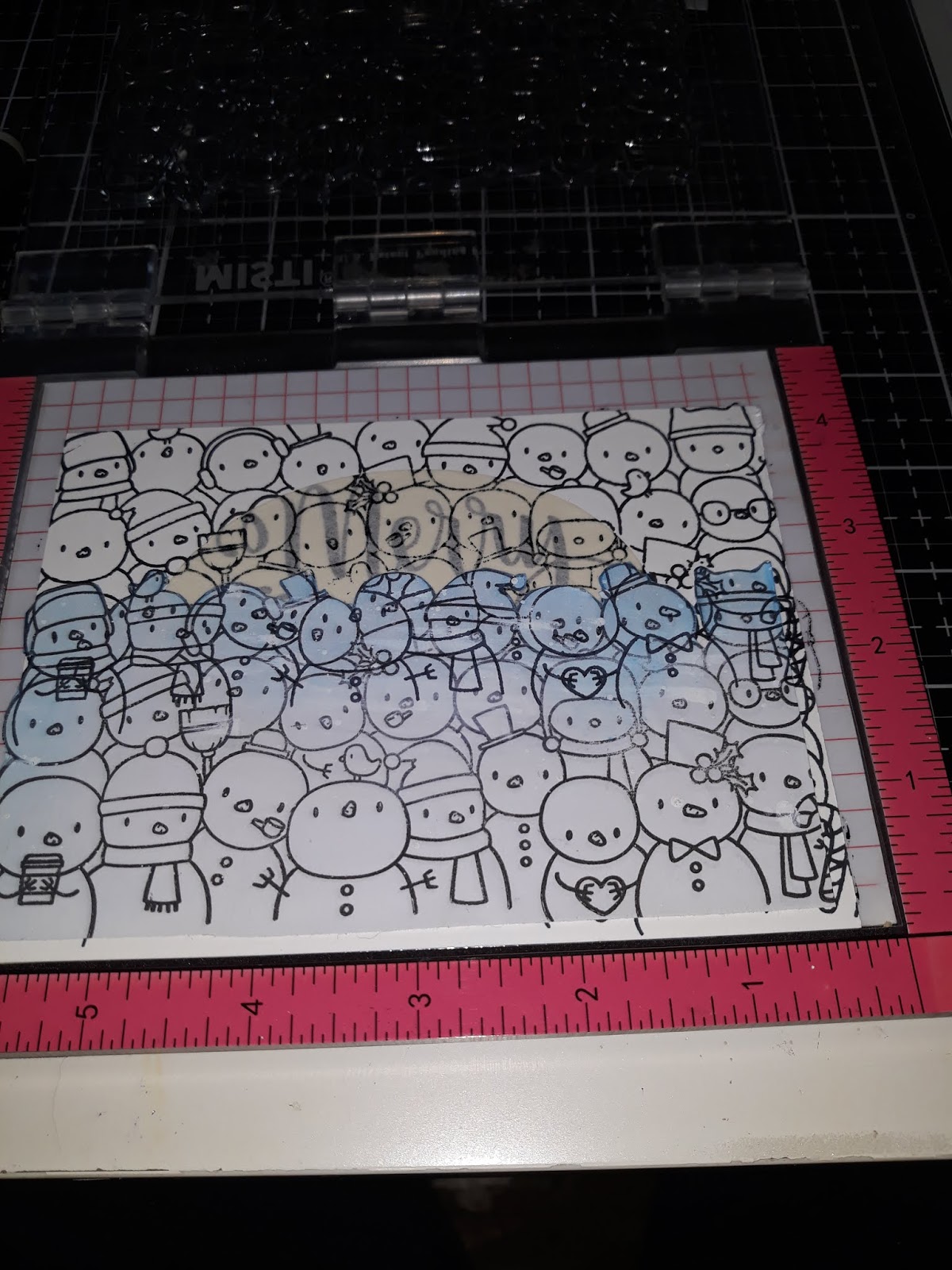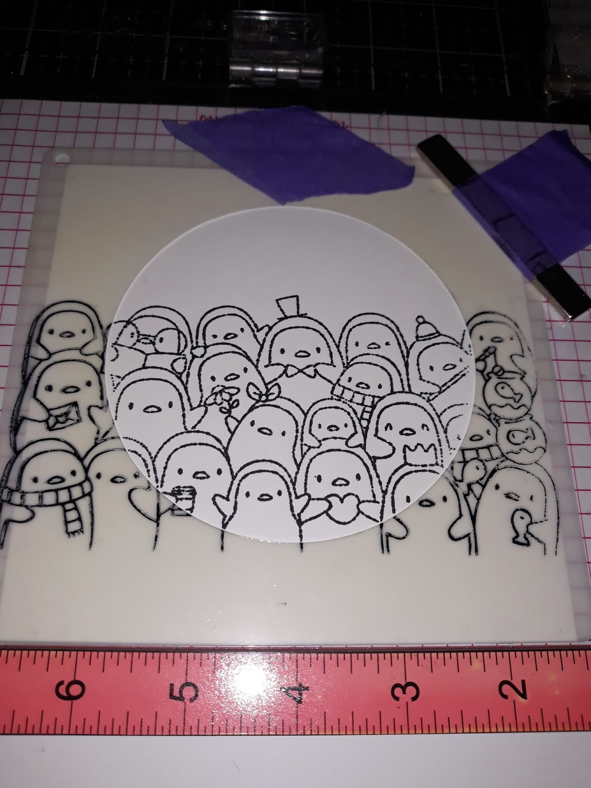 Place the mask over the card blank and stamp penguins on to card blank remove stencil.