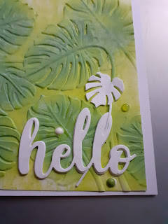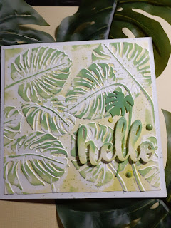 Die cut the Monstera leaf die, coloured with a blending tool and added to the sentiment.