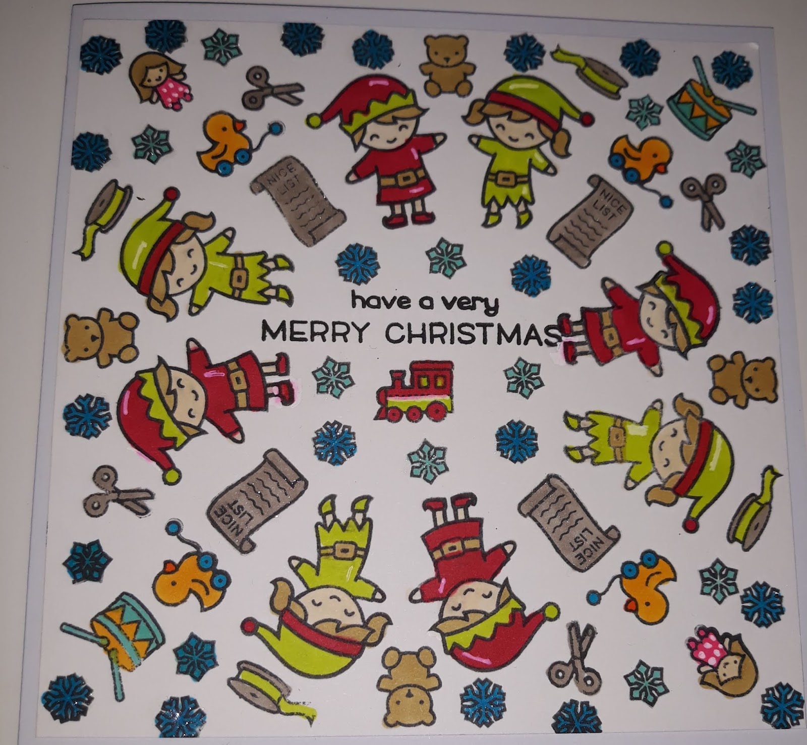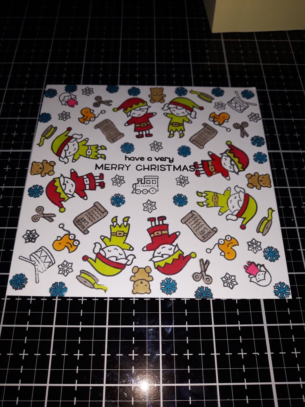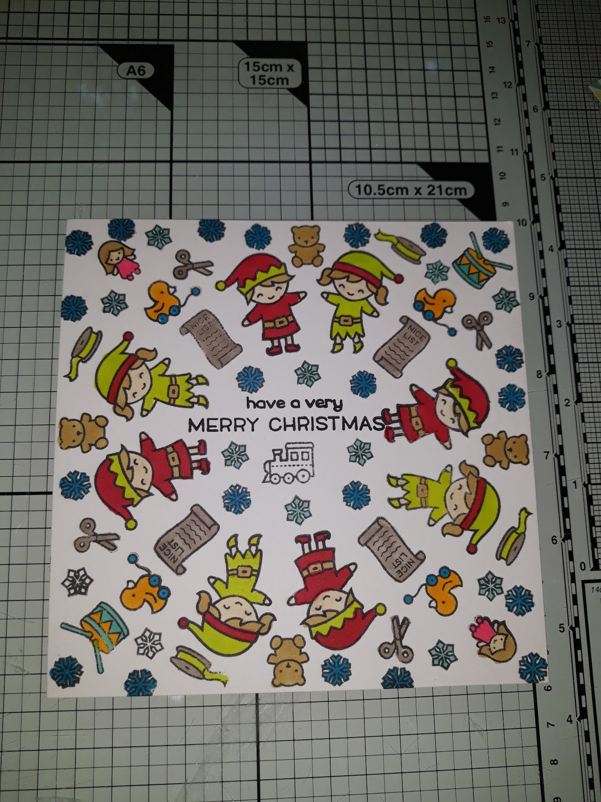 When I had used all the available space, I stamped the sentiment into the center and a few more images to finish it off. I then pulled out my markers.