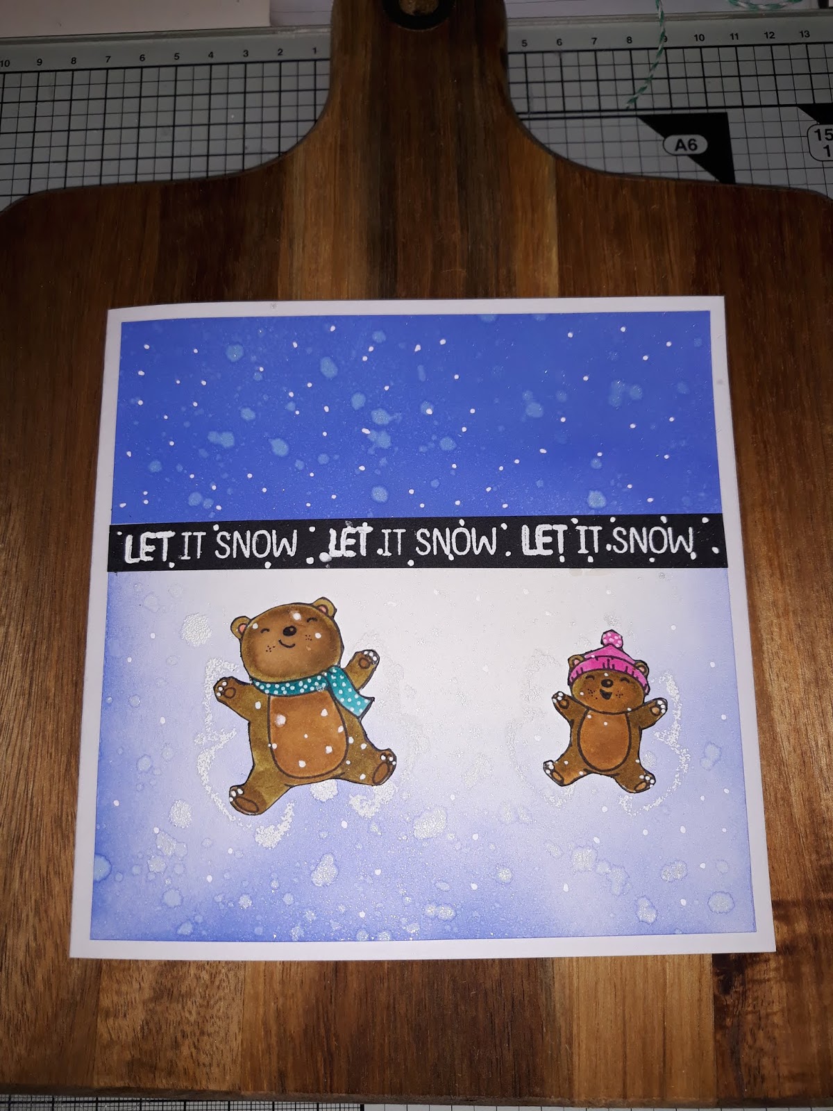 Take a strip of black card stock and stamp out "Let it Snow", three times.