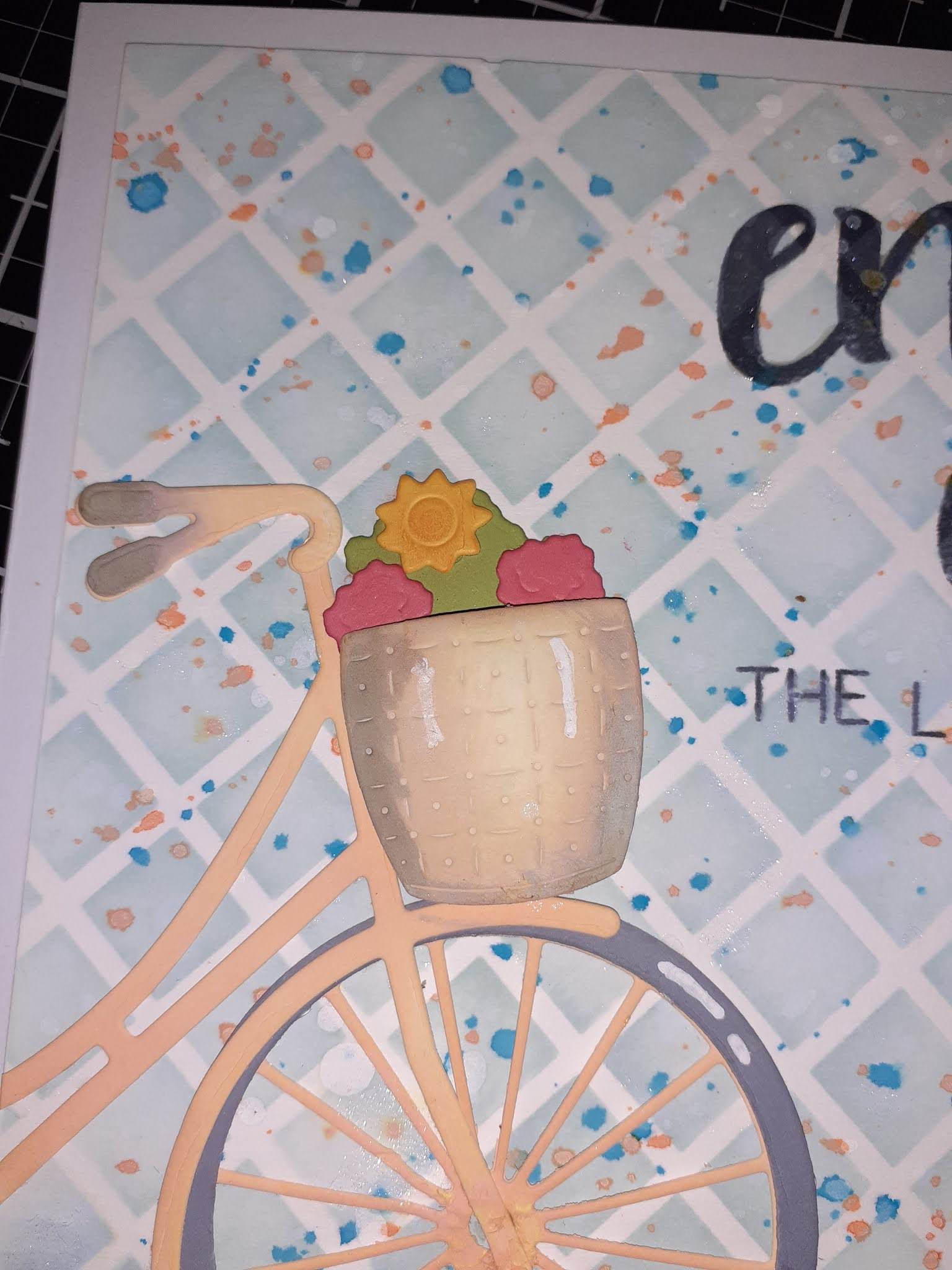 Once stamped I then colour my basket in Antique Linen and again added shading with Brush Corduroy. Using mounting tape I positioned it on to the bike. Using a white Jelly Roll pen I added high lights to the basket and wheel.