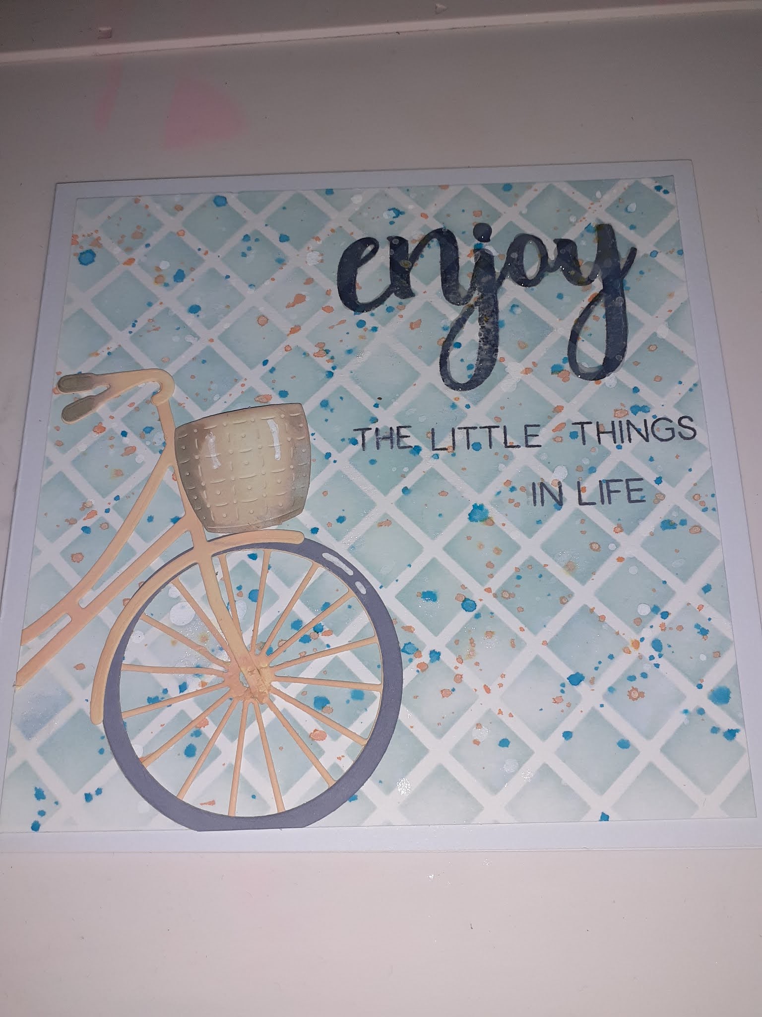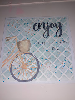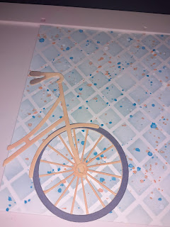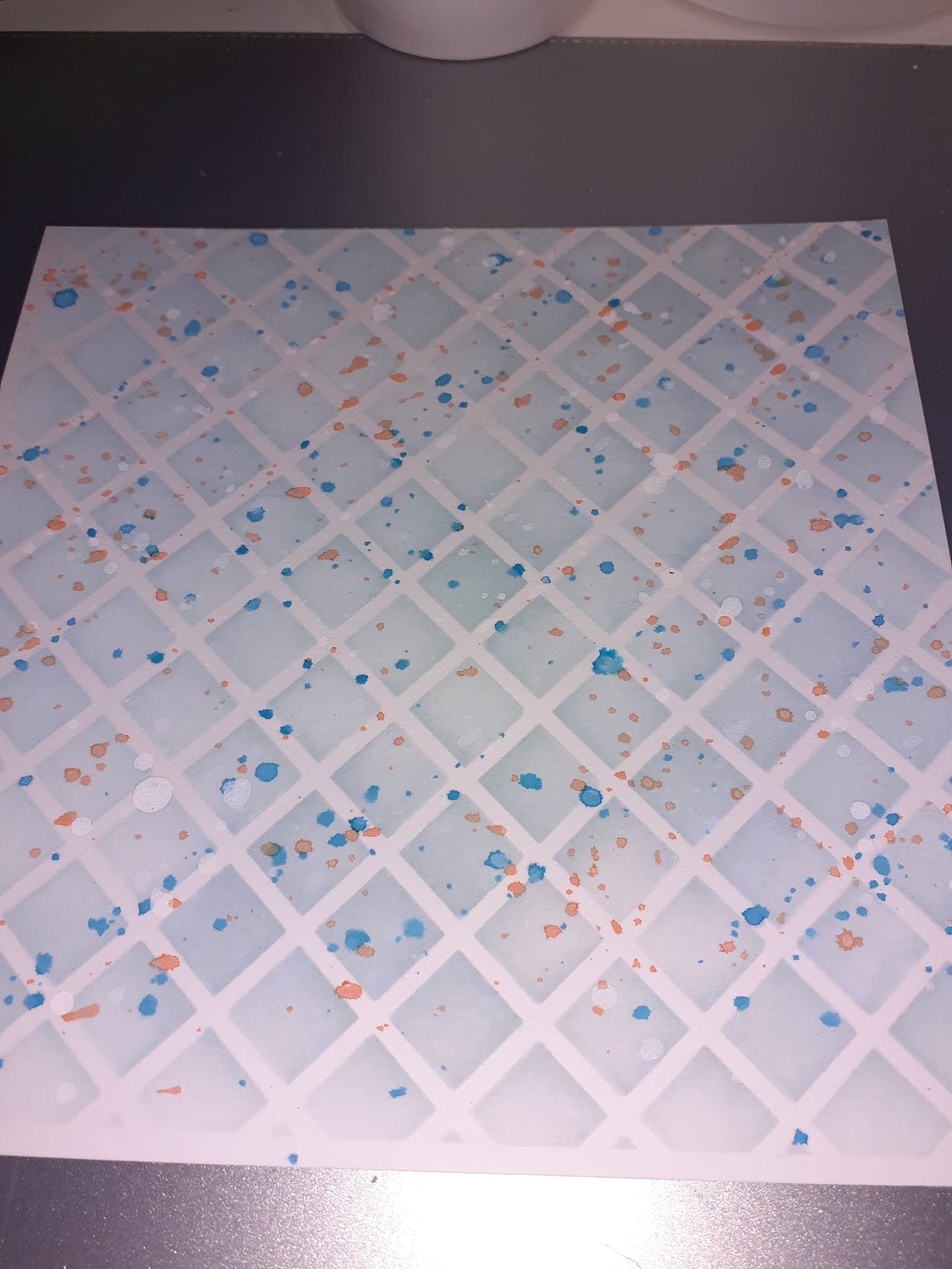 Then using your sprays, splatter your stencilled background in both colours. I remove the nozzle from the bottle and splash the ink from the straw part of the applicator.
