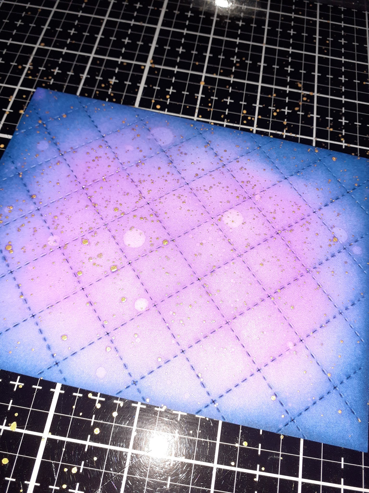 Using a blending tool first blend on the Wild Lilac then come around the outer edges with the In The Navy ink colour. Then add splats of water leave for a minute and dry with a paper towel. Then add splats of the Yellow Gold and set aside to dry.