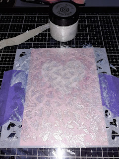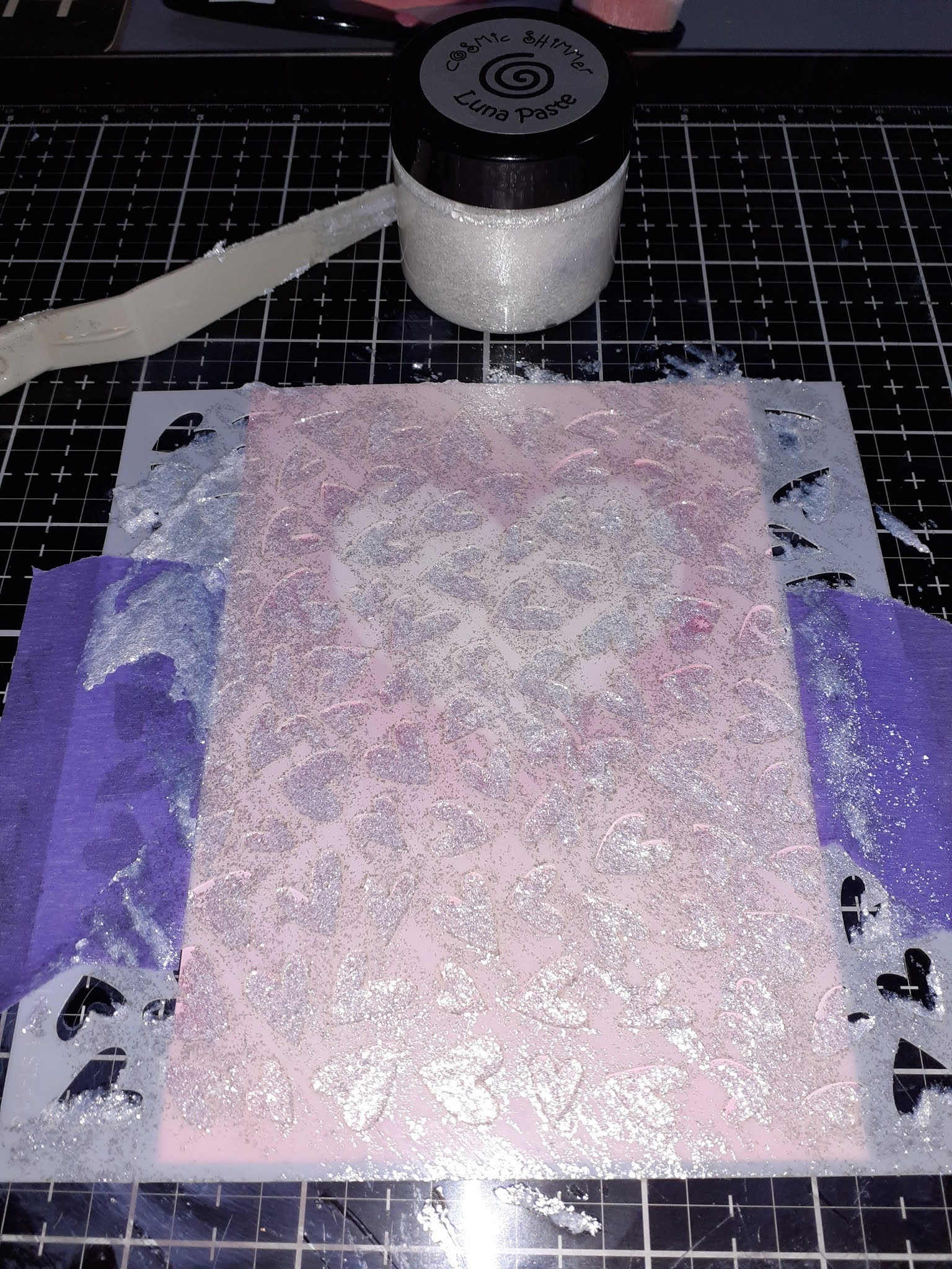 Using the Nuvo paste and spatula apply a thin coat over the heart section of your work. The surrounding area is mask off by the first stencil, so don't worry about getting it in the wrong place.