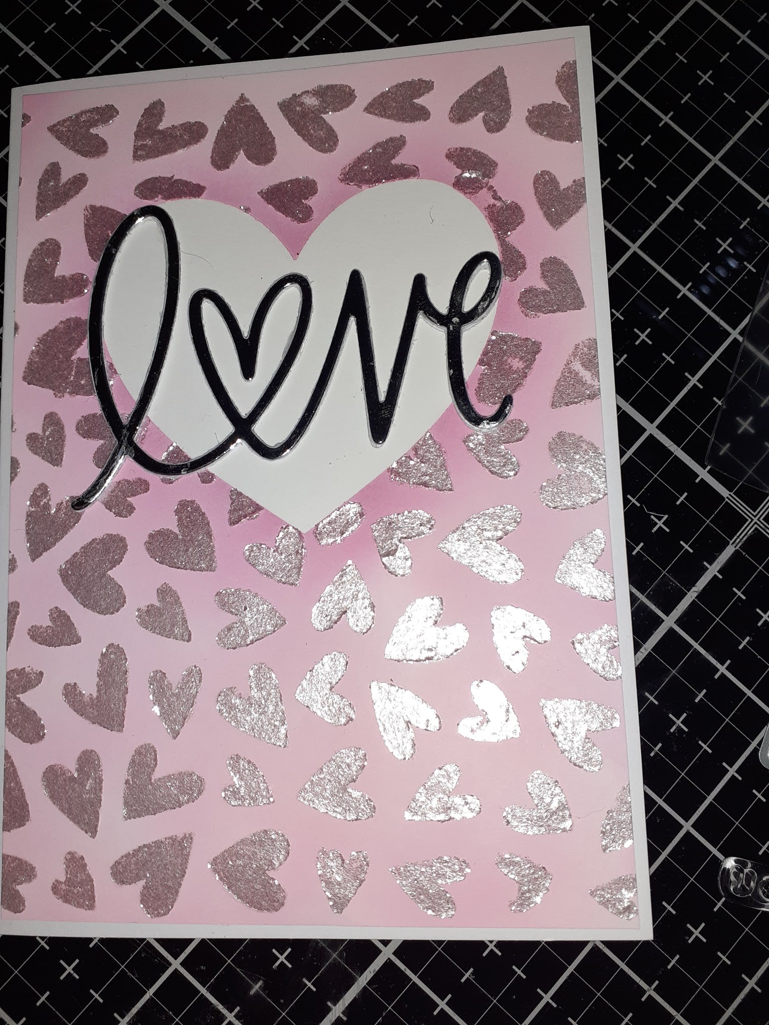 Place the Loads of Hearts stencil over the top, do not remove the heart mask.