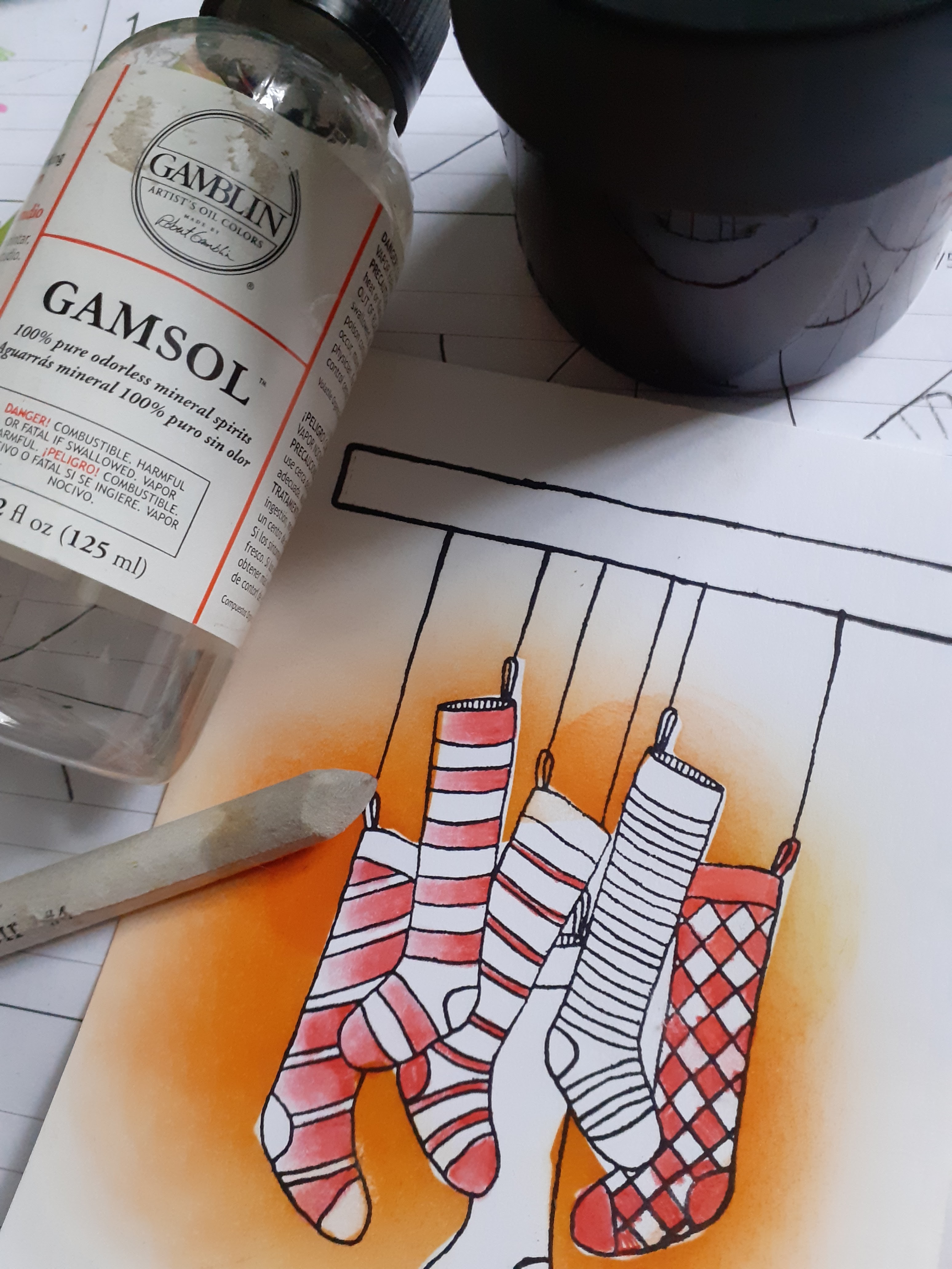 Using a stump and Gamsol, dip the stump in to the Gamsol until it is quiet damp. the in little circular motions tease the colour pencil layer down and drag it out to blend that area.