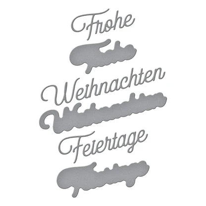 German Holiday Sentiments Etched Dies are part of the International Holiday Sentiments Collection and the seasonal version of the International Sentiments Collection. This set of six thin metal cutting dies cuts three sentiments with with shadows for a bolder look. Sentiments include Frohe, Weihnachten and Feiertage.