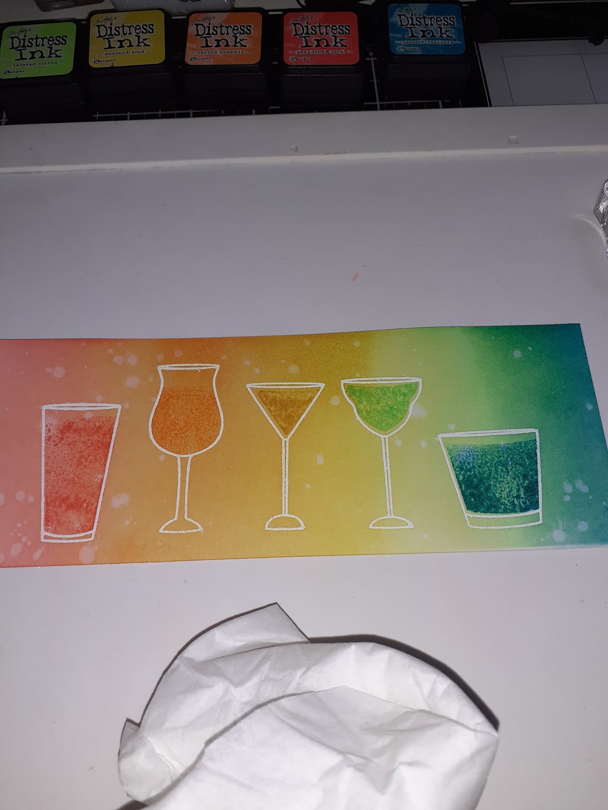 Avant d'ajouter au recto de votre carte, ajoutez des images estampillées à l'encre sans alcool et des images colorées à l'alcool dans et autour de vos lunettes.