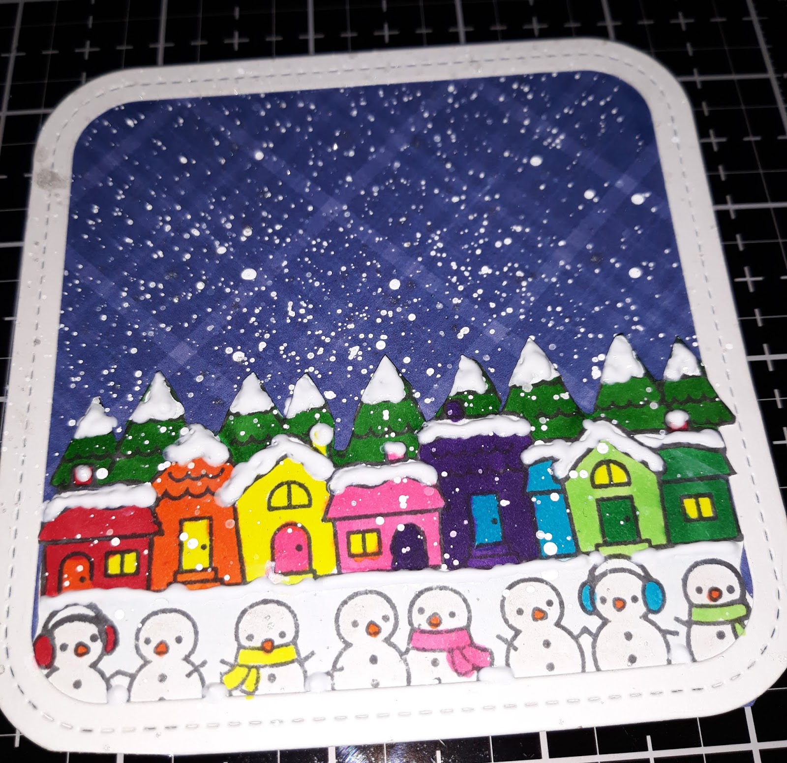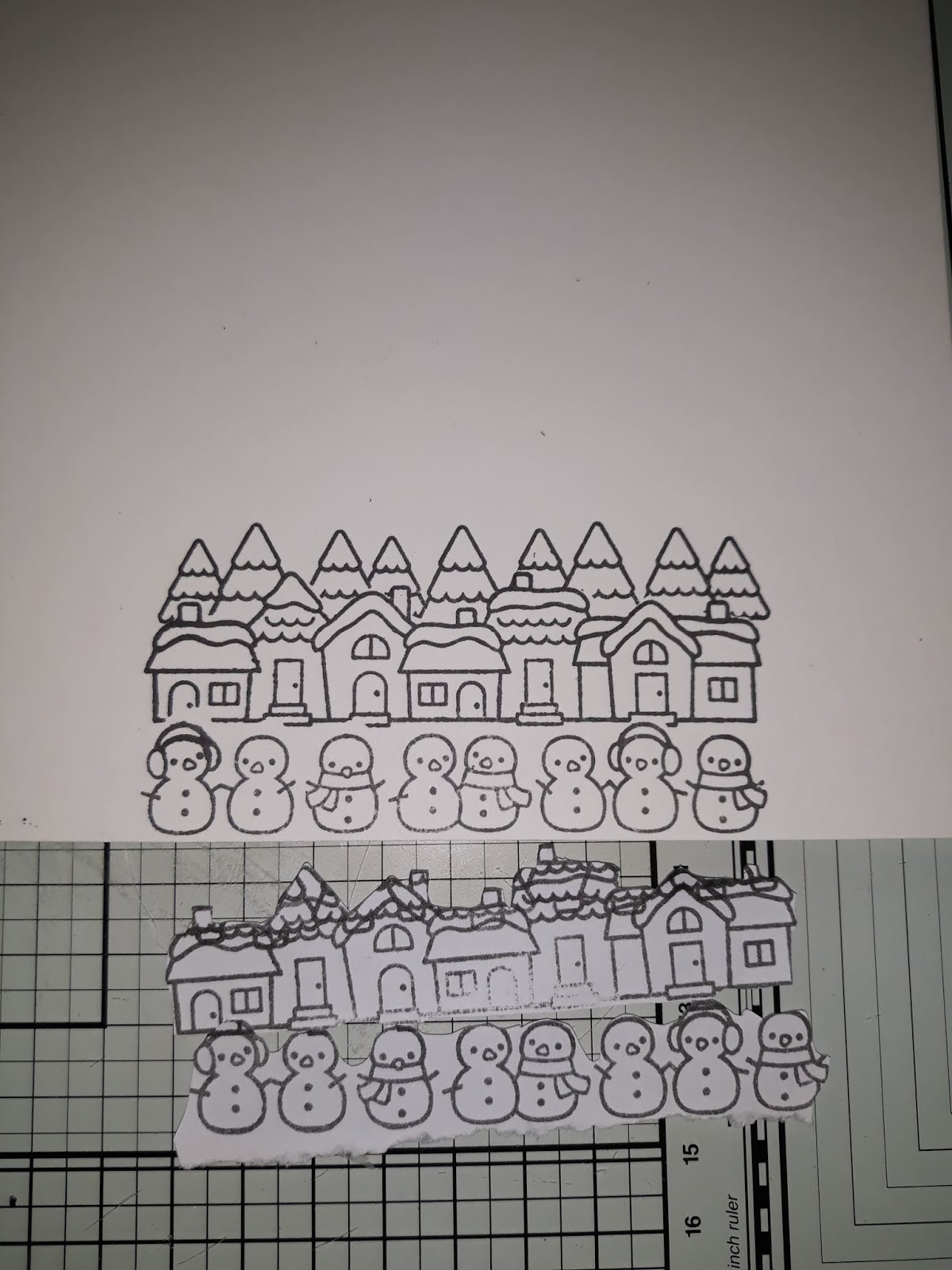 J'élimine les bonhommes de neige, car ils sont devant ma scène. Je les tamponne ensuite sur du papier de masquage et je les recouvre. Ensuite, j'efface les maisons, je crée à nouveau un masque et je les recouvre. enfin je tamponne les arbres.