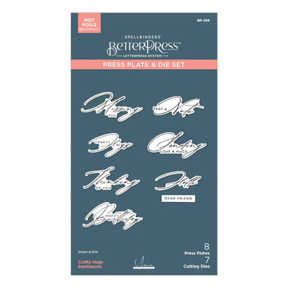 Crafty Hugs Sentiments Plate & Die Set is part of Yana's Daisies Collection by Yana Smakula. There are eight sentiment plates with corresponding dies to cut out the seven large sentiments. The smallest sentiment plate, Dear Friend, can be cut into a simple strip. Ink the plates with the BetterPress Ink to be pressed against the BetterPress Cotton Card Panel and Sheets for a crisp letterpress design.