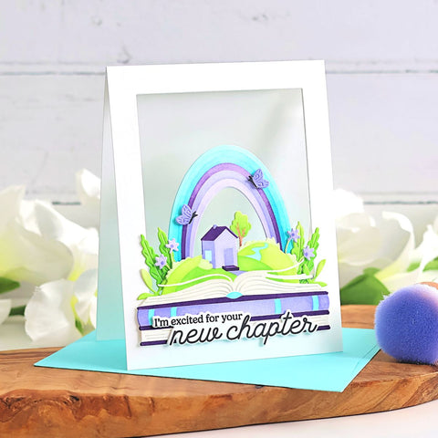 Create enchanting scenes with the Nature’s Narrative, designed by Dawn Woleslagle. This whimsical design features an open book blossoming into rolling hills, blooming daisies, butterflies, and a rainbow. Each element symbolizes growth, hope, and new beginnings.
