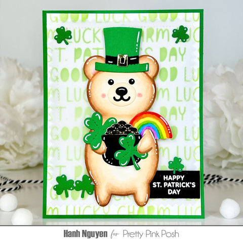 The Lucky Words Stencil features a variety of love- themed words and phrases, such as "Good Luck", "Lucky Charm", and "St. Patrick's Day".