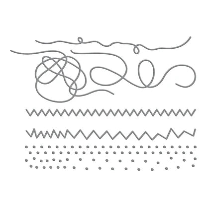 Tangled Threads Etched Dies are part of the Beautifully Imperfect Collection. This set of seven thin metal cutting dies brings wonderful free form accents to any mixed media inspired projects. There are seven different patterns to choose from: three thread designs, two zig zag shapes and two dot motifs. The two dot motif designs cut stitching holes for each of the zig zag dies, perfect for layering together into dimensional sewn paper effect. Or, grab twine or floss and stitch through the holes for extra dimension and texture. Whether you use the dies together to create paper stitching or apart for die cut elements, this versatile set brings endless options.