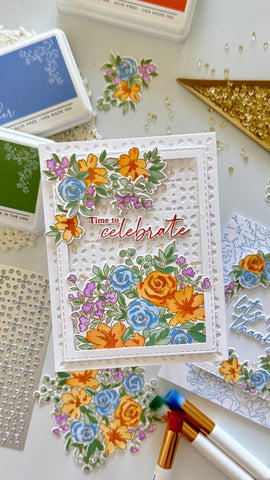 The innovative design has the images clustered together on just two large stamps, allowing you to stamp images simultaneously. The coordinating stencils make you feel like an artist, quickly and easily coloring in multiple images. Use the coordinating one-piece dies to cut every design in one pass, giving you more time to create! All that’s left to do is select a sentiment!