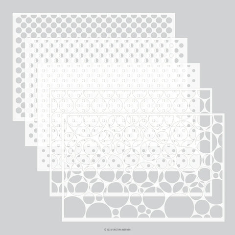 The extra-large 6x9 size of the Dots on Dots Stencils lets you ink up two A2 card fronts at once for quick and efficient crafting. Just cut them apart! Includes 5 dot patterns. 6x9. 5 pieces.