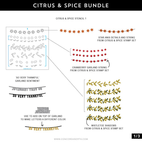 The Citrus & Spice Stamp Set contains several stamps to add detail to the stenciled imagery found in the Citrus & Spice Stencil Pack. The larger, stacked sentiments can be cut out with the coordinating Citrus & Spice Dies. 6" x 6". 14 stamps.