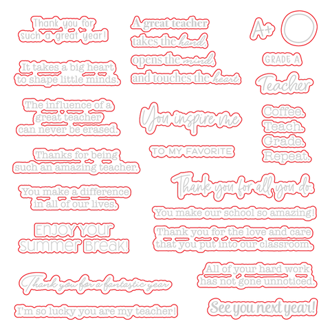 This set includes 21 steel craft dies perfect for honoring your favorite teachers all year round. Designed to coordinate with the coordinating stamp set (sold separately), these pre-clipped dies make crafting a breeze. (Stamp images shown in light gray are for reference only.) Made from durable, high-quality steel, they're compatible with most die-cutting machines, making your projects both fun and easy!