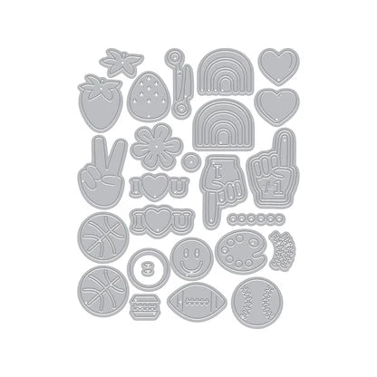 Featuring hearts, rainbows, sports icons, smiley faces, peace signs, and more, these small dies are perfect for decorating jackets, personalizing cards, or creating eye-catching embellishments. Scatter them across a background or cluster them for a statement focal point.