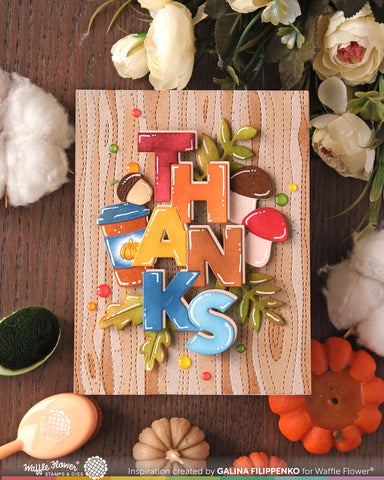 This die features the word “Thanks” arranged vertically with the letters slightly overlapping, so you can cut it out as one solid piece. Try framing two opposite corners with your favorite flower images, then place this word die front and center on a card.
