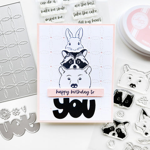 Stamp and use the coordinating Peeking Forest Friends Dies die-cut these adorable animals to nestle alongside word dies, frame dies, and other images for a charming, layered look. Color them in for a playful effect or stamp them solid over neutral cardstock for a clean, classic style.