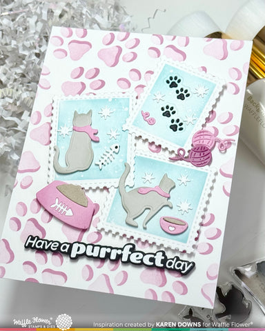 Create playful cat scenes with the Postage Collage Cat Silhouettes Dies. This set includes a variety of cat shapes and small accessories to mix and match. The scale of these dies works seamlessly with the Postage Collage series or can be used on their own in your designs.