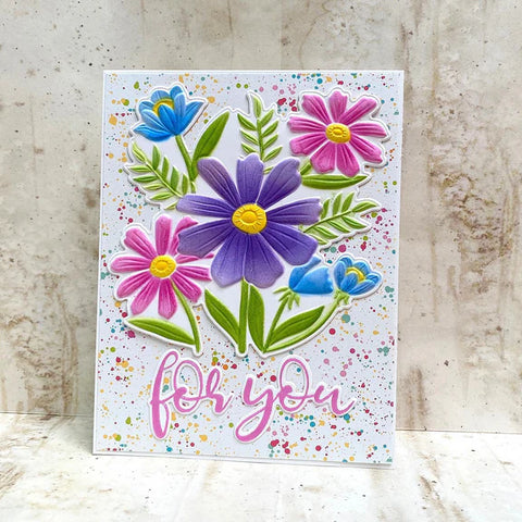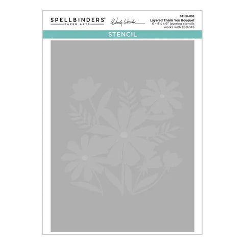 Thank You Bouquet 3D Folder and Stencil Bundle is part of the Tabbed Classic Collection by Wendy Vecchi. The bundle includes E3D-145 Thank You Bouquet 3D Emboss & Cut Folder and the coordinating Layered Thank You Bouquet Stencil (exclusive to this bundle and not sold separately). The 5.50 x 8.50 in. embossing folder has seven thin metal cutting dies which cut all the embossed images. This set creates a beautiful floral bouquet, five individual blooms and a thank you phrase. To step it up a notch, the Layered Thank You Bouquet Stencil enhances the embossed blooms by layering the colors of the bouquet and most of the flowers by partial stenciling.